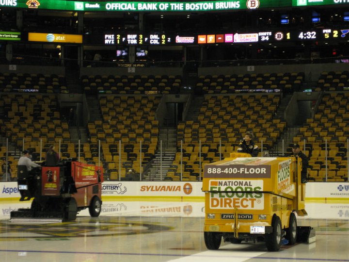 We were in Boston for a Saturday night game (a trip chronicled here) on the second half of a Philadelphia/Boston road trip. This game would come with a special treat. A friend with connections at TD Garden, the Bruins’ arena, had arranged for Ryan to get a post-game Zamboni ride.