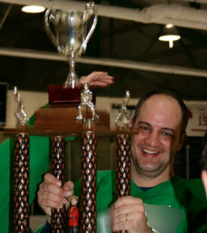 When it was over, nearly collapsed from exhaustion four-plus hours and five games since we took the ice to warm up, the victorious team takes the trophy and skates it all over the rink, passing it from teammate to teammate and taking pictures with it. Champagne is sprayed and beer is consumed from the tiny “cup” that sits atop the trophy.