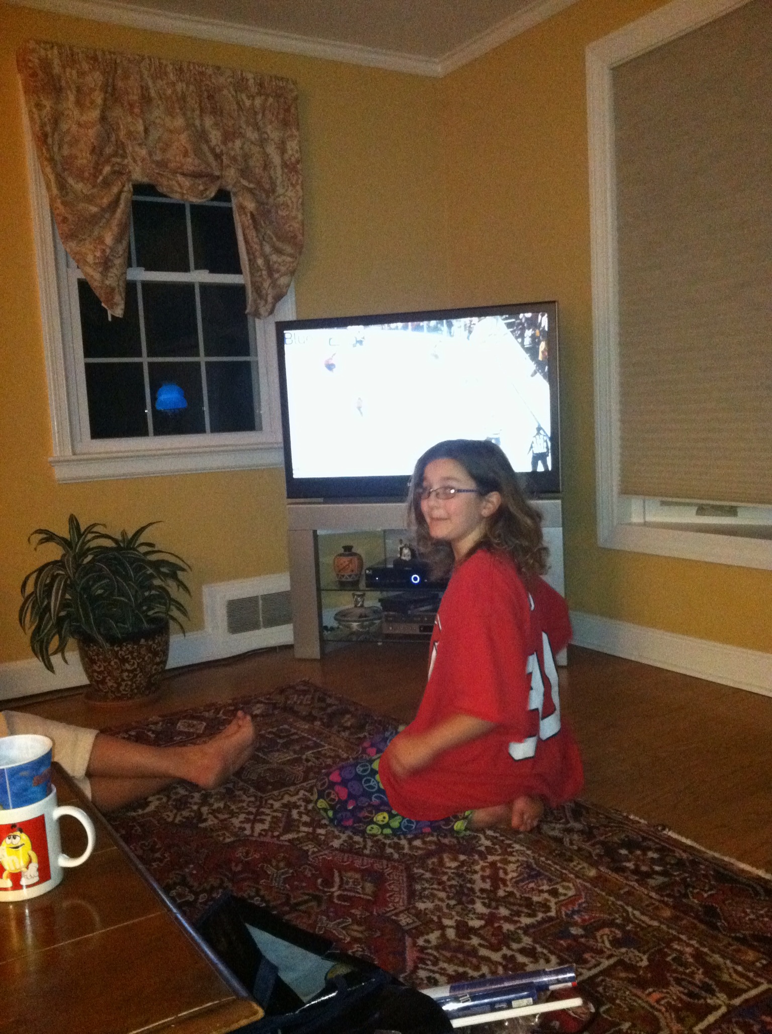 Last night, it was again the Devils’ turn, as they faced Florida in Game 7. The game was on the road, so we set up to watch on TV. With an 8:30 start, Ryan headed to bed before puck drop, still tired from his late night Tuesday. Riley’s plan was to fall asleep in front of the TV. We were given explicit instructions to wake her with 10 minutes left in the game.