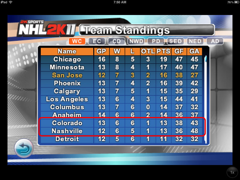 Ryan spends a lot of time playing a couple different NHL games on the Wii. He has gotten good at them and beats me easily when we play. Unfortunately, both of the titles he likes, NHL Slapshot and the NHL 2K series, have been discontinued for Wii, so he tends to grow bored. Recently, I suggested he try the iPad version of the NHL 2K game for a little variety. Ryan reluctantly agreed, but once he did he quickly began playing in season mode.