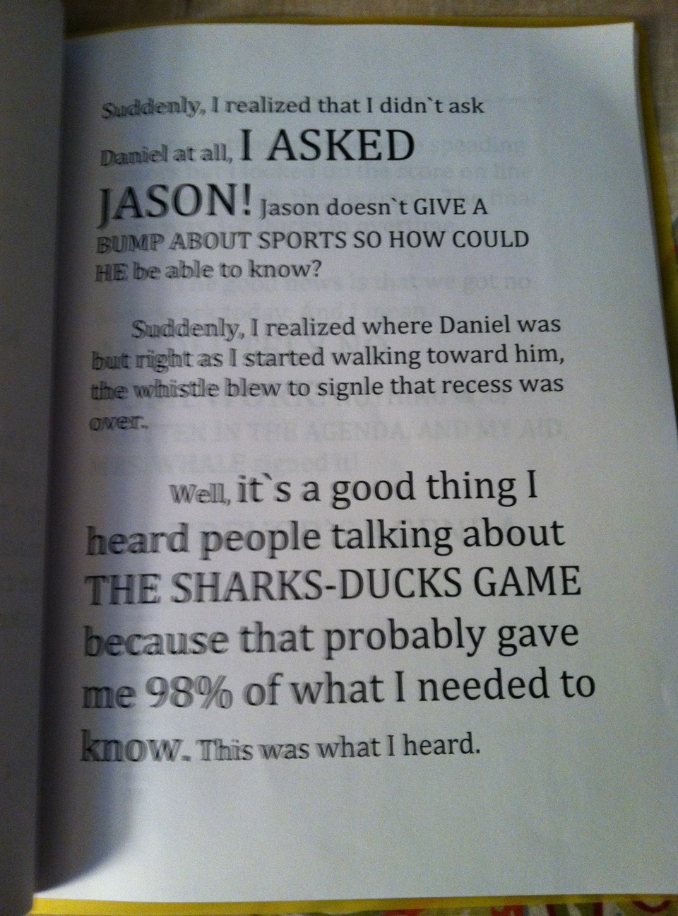 Ryan came racing behind. He did not want me reading his work. He said we would save it for bedtime reading that night. The little that I saw was impressive. Different fonts, interesting layouts, a title page. He had done all the formatting himself. I promised not to read as I put the whole thing into a binder.
