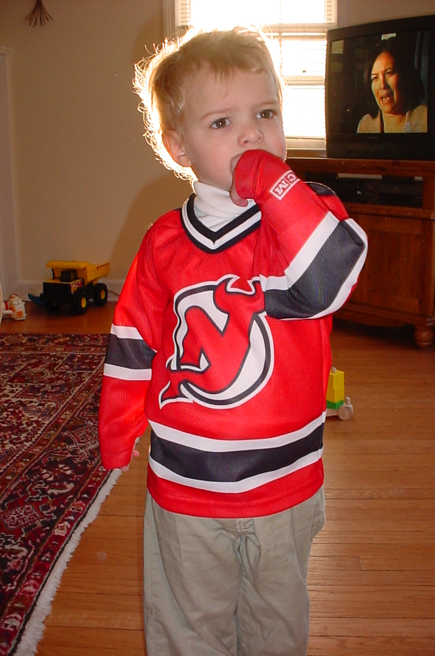 It is one of my all-time favorite photos of Ryan. I had forgotten all about its existence but as soon as I saw it I remembered how much I loved it — mostly for the “halo” effect the sunlight created by shining through his (at the time) blonde hair. I didn’t even remember that he had a Devils jersey at that age. He certainly didn’t know anything about, nor did he care for, the sport that has dominated our lives for the last five or so years. Heck, he was barely talking at that age.